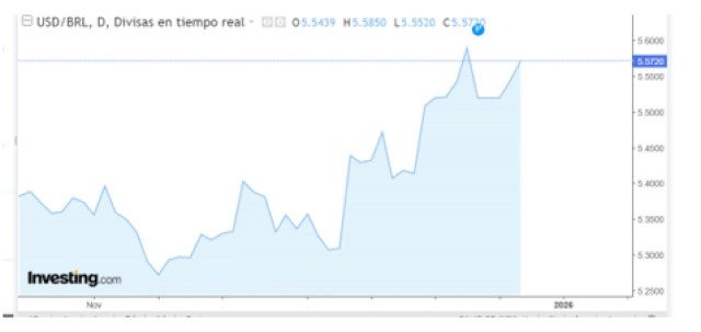 Evolución del dólar en términos del real brasileño desde noviembre a la fecha.