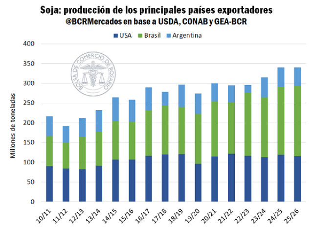 Con la cosecha de soja en EE. UU. ya terminada, el Departamento de Agricultura (USDA) estima una producción americana de 115,8 Mt, 3% menos que la campaña pasada. En Sudamérica, Brasil se alista para comenzar a cosechar en enero otra campaña récord, en tanto que en Argentina la siembra ya ha avanzado sobre el 86% del área de intención. Entre los tres principales exportadores, la cosecha rondaría las 340 Mt, similar al récord de la campaña 2024/25.