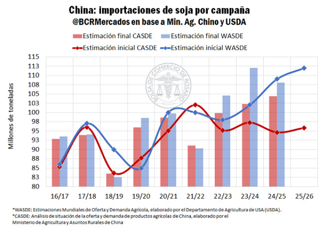 Para este ciclo 2025/26, las expectativas de importación difieren como nunca lo habían hecho. Por un lado, el USDA estima que China comprará 112 Mt de soja en el mercado internacional, mientras que el Ministerio de Agricultura de China baraja importaciones por no más de 96 Mt, casi un 20% de diferencia entre ambas proyecciones. La abismal diferencia entre expectativas iniciales de importación para ambos organismos es una tendencia que se viene agudizando desde hace tres campañas. Para la recién finalizada 2024/25, la estimación inicial del USDA demostró ser mucho más acertada que la china. Sin embargo, para esta 2025/26 las condiciones iniciales han sido similares a las de la campaña 2018/19, primera edición de la “Guerra Comercial”. En ese entonces, la proyección inicial norteamericana estuvo muy por delante la estimación final, mientras las asiáticas dieron en el clavo.