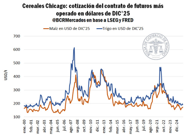 Teniendo en cuenta la inflación, el precio del trigo en Chicago hace dos meses llegó a mínimos de noviembre del 2005 y actualmente cotiza en niveles comprables con el mínimo de septiembre del 2016 y con el promedio de los años 2000 al 2005. Misma dinámica que afecta a las cotizaciones por el maíz que en agosto del 2025 se negoció, en dólares constantes, al precio más bajo desde abril del 2006.