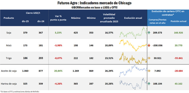 Cerró el año 2025 y llegó la hora de los balances. Punta a punta, la soja termina fortalecida en el mercado de referencia de Chicago, con una suba del 3,2% interanual. La intensidad del enfrentamiento comercial entre Estados Unidos y China fue de más a menos a lo largo del año, concluyendo con un principio de acuerdo en el encuentro de los principales mandatarios en Corea del Sur, lo cual brindó fortaleza a la oleaginosa. En derivados, el comportamiento fue asimétrico: el aceite de soja trepó 20,8% interanual, fortalecido por el impulso a la producción de biodiesel, mientras que la harina cayó 4,3% frente a diciembre de 2024.
