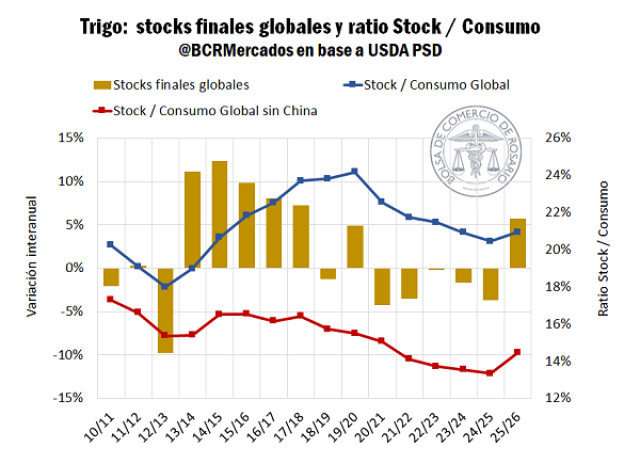 Para la campaña 2025/26, el USDA proyecta una producción global de trigo de 837 Mt, récord mundial, 5% arriba del ciclo anterior y 10% sobre la última década. Con el hemisferio norte ya cosechado y el sur aportando volúmenes máximos (Australia 35,6 Mt según ABARES y Argentina 27,7 Mt según GEA-BCR), el consenso internacional es de oferta holgada, con un nivel de consumo esperado que viene creciendo más lento y, por lo tanto, stocks finales en aumento. De hecho, sería la primera variación positiva de stocks finales globales en seis años.