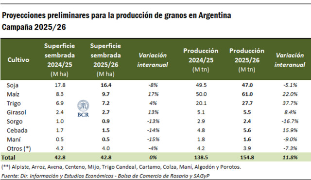 De esta manera, la producción total de granos en la 2025/26 podría alcanzar 154,8 Mt, un 12% más que el volumen total obtenido en la campaña previa y quedando como la de mayor producción de la historia, superando los 141,5 Mt del ciclo 2018/19.