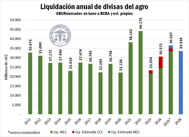 No obstante, la proyección para 2026 se ubica un 8% por debajo, con un total estimado de US$ 33.600 para el año. La principal explicación de esta caída obedece al adelanto en la liquidación de divisas que significó la eliminación temporaria de retenciones aplicada a fines de septiembre.