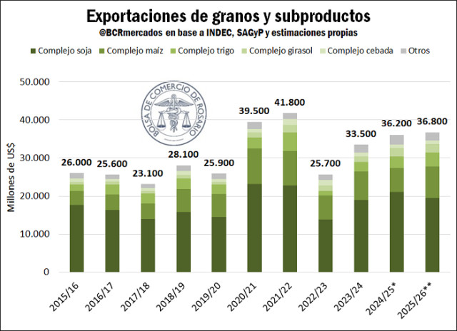 El complejo soja aportaría US$ 3.670 millones, prácticamente idéntico al año 2025 (+1,4% i.a.). En segundo lugar, se erige el complejo maíz, con US$ 725 millones (+32% i.a.). El trigo se proyecta aporte US$ 248 millones (+0,8% i.a.). Destaca el aumento en el aporte del complejo girasol producto del mayor volumen proyectado a exportar, con un estimado de US$ 95 millones (+18% i.a.).