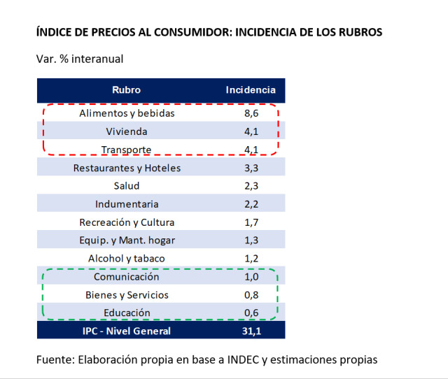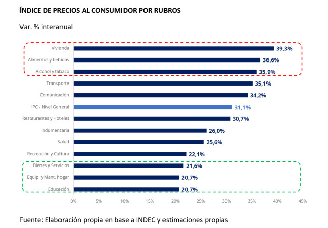 Durante el año, la inflación anual se ubicó en torno al 31,1%, aunque no todos los rubros evolucionaron al mismo ritmo. Teniendo en cuenta el comportamiento heterogéneo mencionado, podemos destacar los rubros que sufrieron el mayor incremento interanual: Vivienda (+39,3%), Alimentos y bebidas (+36,6%) y Alcohol y tabaco (+35,9%), todos por encima del nivel general. En contraste, Educación (+20,7%), Equipamiento y mantenimiento del hogar (+20,7%) y Bienes y servicios (+21,6%) mostraron aumentos considerablemente más moderados.