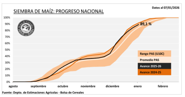 El avance de la siembra de maíz alcanza el 89,1 %. A su vez, el 68,8 % del maíz temprano continúa transitando su período crítico. La ausencia de precipitaciones en áreas del oeste agrícola empieza a reflejarse en la condición hídrica.