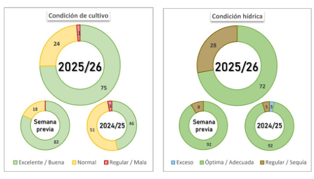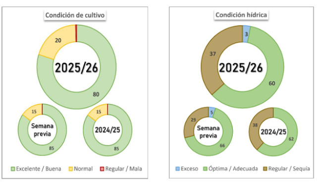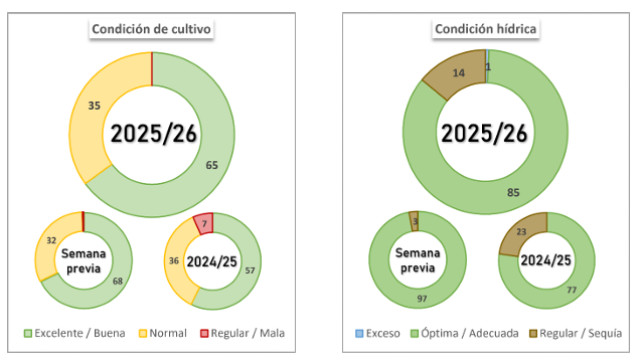 sostiene una elevada demanda de humedad. En este contexto, se requieren nuevos aportes hídricos en el corto y mediano plazo para sostener la condición del cultivo, que aún se mantiene en Normal/Excelente en el 100 % del área, especialmente en los lotes que se encuentran en transición hacia etapas de generación de rendimiento.