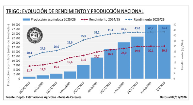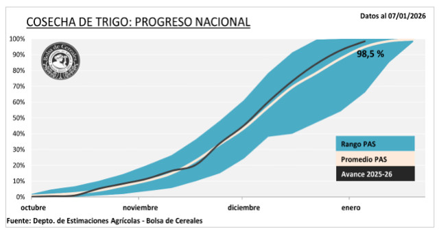 Luego de un progreso intersemanal de 5,8 p.p. la cosecha cubre el 98,5 % del área apta. El rinde medio nacional se ubica en 43,4 qq/Ha, dado los rindes por encima de lo esperado sobre el sudeste bonaerense.