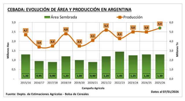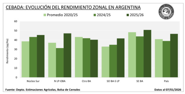 Finalmente, luego de un progreso interquincenal de 39 p.p., finaliza la cosecha de cebada para la campaña 2025/26, si bien quedan algunos lotes por recolectar sobre el centro y sur bonaerense, estos no afectan nuestra estimación de producción. Rendimientos superiores a los registrados en el último informe sobre el centro y sudeste bonaerense aumentan la producción en 100.000 toneladas. El rinde promedio nacional finaliza en 46,6 qq/Ha, 19 % superior a la previa campaña y 14 % por encima del promedio de los últimos 5 años, consolidando la mejor campaña de los últimos 10 años. Bajo este contexto se ajusta a 5,4 MTn la producción para la actual campaña, quedando también como la mejor producción de los últimos 10 años.