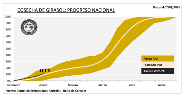 Luego de un avance intersemanal de 4,3p.p., la cosecha de girasol cubre el 11,1 % del área apta a nivel nacional. El rinde promedio se ubica en 22,7 qq/Ha, por encima de los valores medios para esta altura de la campaña.