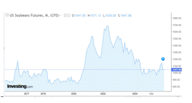 En Chicago, este lunes la soja bajó respecto a marzo USD 4,96 y mayo, USD 4,68