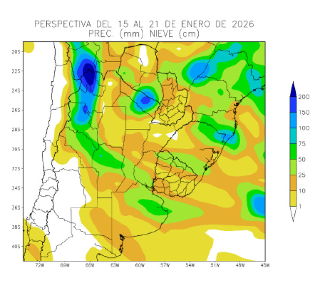 La perspectiva comenzará con temperaturas elevadas, pero con muy corto intervalo tendrá lugar la llegada de un frente de tormenta, produciendo lluvias muy desparejas, con registros abundantes sobre una franja que correrá en diagonal desde el NOA, pasando por el sur de la Región del Chaco, y extendiéndose de noroeste a sudeste sobre la Región Pampeana, pero dejando a gran parte del área agrícola con registros escasos. Junto con el frente, llegará una masa de aire fresco, provocando temperaturas bajo lo normal en la mayor parte del área agrícola, a excepción de sus porciones centro-norte y nordeste, que observarán registros normales a superiores a lo normal. Los vientos del trópico retornarán con vigor restableciendo el calor en la mayor parte del área agrícola a excepción de la franja atlántica, Córdoba y aledaños, que recibirán vientos marinos.