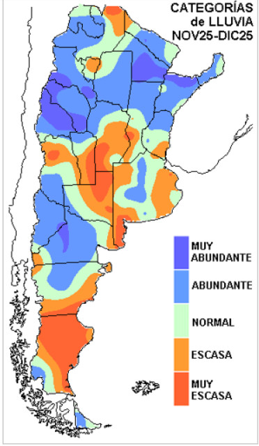 Podemos notar que durante el último bimestre, ha habido alternancia de anomalías en otras regiones del país. De todos modos, en términos estrictamente agrícolas, la escasez de lluvia en zonas de LP y sudoeste de CB, posiblemente se ha llevado la peor parte. En otro sentido, la retracción marcada de las lluvias durante diciembre en la provincia de BA, sobre todo en las zonas donde se venían padeciendo inundaciones desde comienzos del otoño, ha promovido un marcado retroceso de los anegamientos, visualizando una resolución acelerada de esta problemática. En algunos sectores donde las complicaciones eran menores, la escasez pluvial no ha permitido avanzar con siembras tardías.