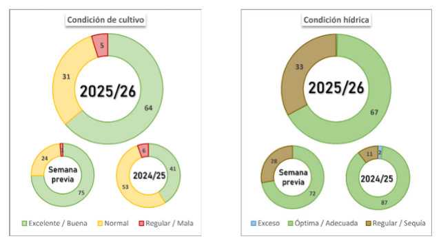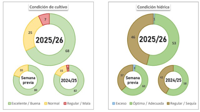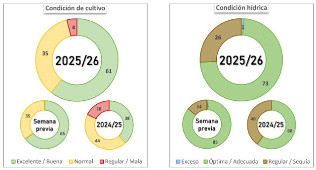 La siembra cubre el 93,9 % de la superficie proyectada. Si bien se registra una disminución en la condición hídrica, el 95,1 % de lo implantado sostiene una condición de cultivo Normal/Buena.
