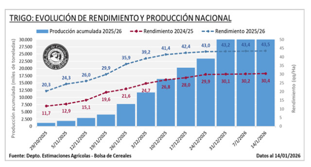 Por último, finaliza la cosecha de trigo, alcanzando una producción estimada de 27,8 MTn, constituyendo el máximo histórico nacional. El rinde promedio nacional de 43,5 qq/Ha se ubicó 50,4 % por encima del promedio de las últimas cinco campañas, con rendimientos que superaron los valores históricos en todas las regiones del área agrícola. De esta manera, la campaña culmina con un volumen excepcional, sostenido por un desempeño productivo generalizado y sin desvíos durante el tramo final de la recolección.