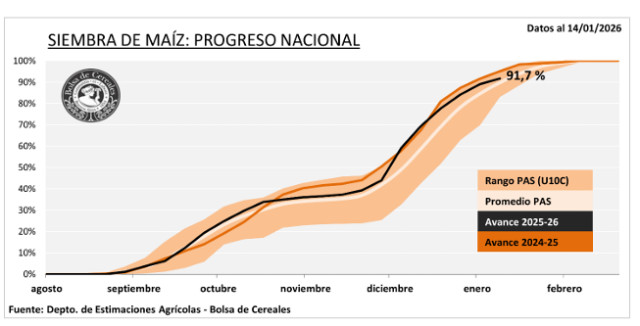 La siembra de maíz alcanza el 91,7 % del área nacional proyectada. El 74 % del maíz temprano transita su período crítico, con un 93 % del cultivo con una condición de Normal a Buena.