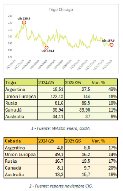 La campaña 2025/26 tanto de trigo como de cebada fue de gran producción en términos globales. En el caso del trigo, según datos de USDA, la misma alcanzó las 842,17 Mt (+5%i.a) traccionada por un muy buen ciclo de los principales productores mundiales, especialmente Argentina, Rusia y Canadá.