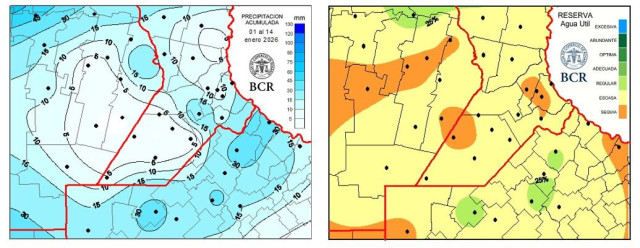 En esta etapa, el promedio de lluvias fue de 13 mm cuando la media de la región es de 60 mm. Hay estaciones de la red meteorológica de GEA en el sudeste de Córdoba que no registraron milimetrajes, como Labordeboy, Canals y Guatimozín. Las que más midieron fueron las de la localidades de Colonia Almada, con 47 mm; General Pinto, con 41 mm; y Ramallo y Pergamino, con 40 mm. En El sur de Santa Fe, Bigand acumuló 26 mm. De esta manera, las reservas de agua a 1 metro de profundidad teniendo en cuenta el consumo de una pradera permanente están entre escasas a sequía, con algunos pocos focos regulares, zonas privilegiadas por lluvias aisladas en las últimas semanas.