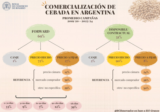 En conjunto, los datos muestran que casi la totalidad de la cebada comercializada en Argentina se origina en Buenos Aires, precisamente en los partidos del sur, en línea con las principales zonas productoras del cultivo. A su vez, casi 7 de cada 10 toneladas tienen como destino las terminales portuarias del país (Gran Rosario y Sur de Buenos Aires), dando cuenta del marcado perfil exportador de este cultivo, en tanto otra proporción relevante se dirige al Este de La Pampa y al resto de la provincia de Buenos Aires. Respecto a la comercialización, la cebada se negocia principalmente bajo contratos de compraventa previo al inicio de la campaña comercial, con entrega forward.