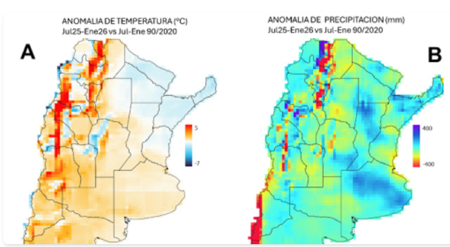 Con ese marco, antes de mirar hacia adelante conviene responder una pregunta más simple y útil: ¿Cómo venimos hoy respecto de la historia? Los mapas de anomalías de Jul25–Ene26 vs Jul–Ene 1990–2020 (Figura 1) muestran un patrón consistente de contrastes regionales que ordena el punto de partida para cada decisión. Llevado a las 7 zonas AAPRESID: el NOA combina el mayor exceso térmico con déficits o lluvias muy irregulares; el NEA aparece en general húmedo, con temperatura más cercana a lo normal; el Litoral destaca por un sesgo húmedo con recargas/excesos en varios sectores; el Centro muestra humedad moderada a alta, pero con un gradiente hacia el oeste más restrictivo; el Nodo Oeste y el Oeste Medanoso son los que más “sienten” la combinación de calor y lluvias menos consistentes; y el Sur aparece mayormente húmedo, con temperatura levemente superior a la media. Este “estado de situación” es el filtro básico: define cuánta sensibilidad tiene cada zona a un trimestre más cálido y cuánta dependencia tendrá la cantidad y el timing de las lluvias.
