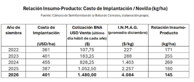 Actualmente, el costo de implantación de pasturas medido en kilos de novillo -según el Índice Novillo del Mercado Agroganadero (I.N.M.A.G.)- se ubica un 35% por debajo del promedio histórico.