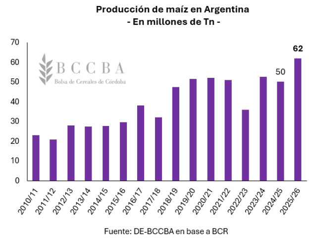 En Argentina, la Bolsa de Comercio de Rosario proyecta un área sembrada de 9,7 millones de hectáreas de maíz a nivel nacional para la campaña 2025/26, lo cual implicaría un aumento del 17% respecto al ciclo previo (8,3 Mill Ha). Además, desde la institución destacan que se podría alcanzar una producción récord de 62 millones de toneladas, 12 millones de toneladas por encima de lo materializado durante el ciclo 2024/25 (50 Mill Tn). Por otra parte, según SAGyP, ya se lleva sembrada el 92% del área destinada al cereal a nivel nacional.