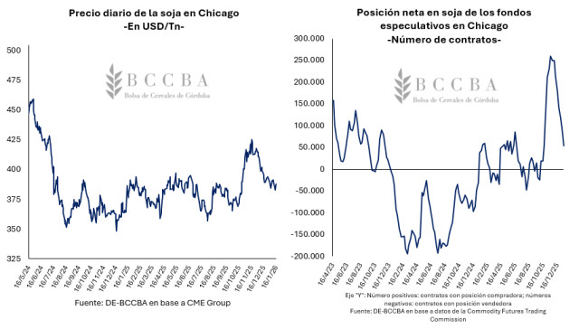 En este contexto, en lo que va de enero el precio promedio del maíz en Chicago alcanza los USD 170/Tn, alrededor de USD 17/Tn por debajo se lo observado en enero del 2025. En el caso del cereal, el informe del USDA provocó una caída diaria de USD 10/Tn en el precio operado en la plaza norteamericana, superando a las caídas registradas para la soja. Además, los fondos especulativos han rotado sus posiciones respecto al cereal, encontrándose vendidos en aproximadamente 63.550 contratos.
