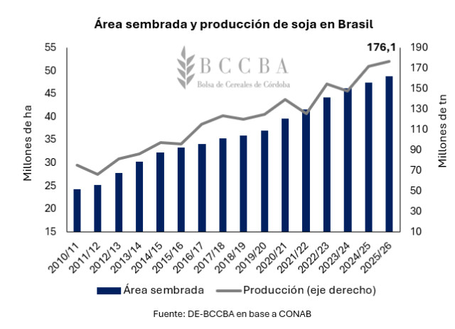 En Brasil, la Compañía Nacional de Abastecimiento (CONAB) estima que 48,6 millones de hectáreas fueron destinadas a la siembra de la oleaginosa, lo cual implicaría un aumento del 2,8% en comparación al ciclo 2024/25. A la fecha, las labores de siembra prácticamente han finalizado y ya se aprecian los primeros avances de cosecha. En cuanto a la producción, de darse un rinde similar al observado durante el ciclo previo (36,2 qq/ha), se alcanzaría una cosecha récord de 176,1 millones de toneladas (+2,7% intercampaña).