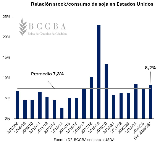 Por otra parte, el USDA ha realizado modificaciones interesantes en la hoja de balance estadounidense que sorprendieron al mercado y derivaron en un aumento de los stocks finales de la oleaginosa. De esta manera, los stocks alcanzarían los 9,5 millones de toneladas (+20% intermensual) y superarían a las existencias finales observadas durante la campaña 2024/25 (8,8 Mill Tn). Bajo este escenario, la relación stock consumo se posicionaría en un 8,2% (+ 1,5 pp intermensual), ubicándose por encima del porcentaje alcanzado durante el ciclo previo (6,7%) y del promedio de las últimas 18 campañas (7,3%).