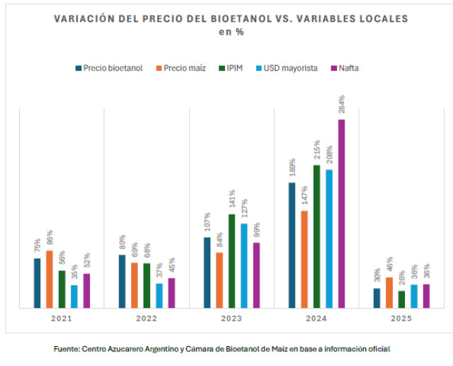 En 2025 el precio del bioetanol a nivel local fue de USD 0,63 -promediando entre aquel a base de maíz y el producido a base de caña-. Esto implicó que en relación con 2024 el precio promedio medido en dólares se contrajera en USD 0,02 / litro.