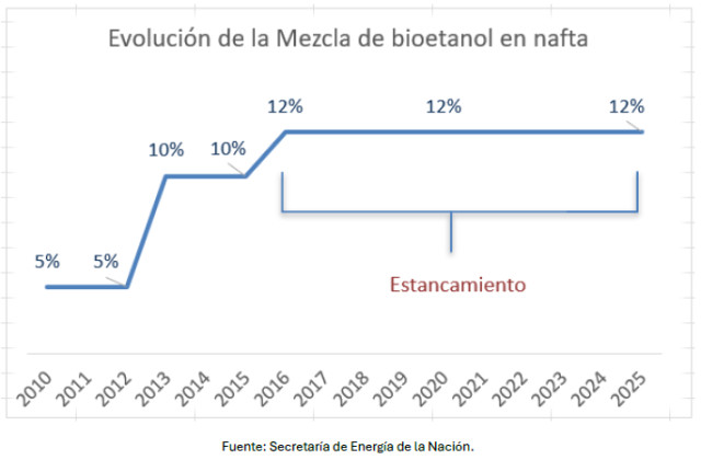 El nivel de mezcla obligatoria del 12% de bioetanol en las naftas comercializadas en Argentina se cumplió en 2025, mejorando 0,5 puntos porcentuales vs.2024.