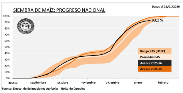 La siembra de maíz alcanza el 93,1 % del área proyectada, aunque con una demora interanual de -5,3 p.p. Las labores continúan atrasadas en el NOA y el NEA, y se intensifican los monitoreos de Dalbulus maidis en diversas zonas del área agrícola.