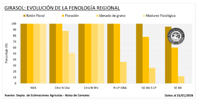 Finalmente, la cosecha de girasol ya avanzó sobre el 21,9 % del área apta, tras un progreso intersemanal de 5,6 p.p., registrando un adelanto respecto al promedio de las últimas 5 campañas de 12 p.p. El rinde nacional se mantiene estable en 22,6 qq/Ha, con valores regionales que se ubican entre 20 y 30 qq/Ha, superando los respectivos promedios zonales históricos. La región del NEA puntualmente se encuentra próxima a finalizar las labores, con un rendimiento promedio que se consagraría máximo de la serie PAS. Mientras tanto, del área aún en pie, si bien un 18,4 % se encuentra en situación de déficit hídrico, concentrado sobre el oeste y sur del área agrícola, el 63,7 % transita entre floración y llenado de granos, manteniendo una condición de cultivo Normal a Excelente en más del 80 % de los casos. Bajo este escenario, y a la espera de la generalización de las labores de recolección en el centro del área agrícola, la proyección se sostiene en 5,8 MTn.