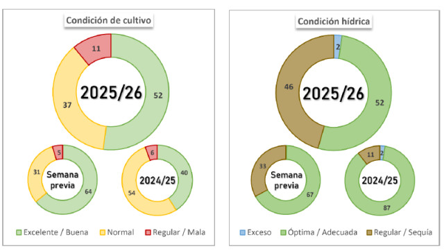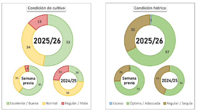 Por su parte, la siembra de maíz con destino a grano comercial cubre el 93,1 % del área proyectada, aunque registra una demora interanual de -5,3 p.p. Las labores continúan retrasadas en el NOA y el NEA debido a la imposibilidad de ingresar a los lotes tras las precipitaciones recientes, mientras que en el Centro-Norte de Santa Fe el incremento de poblaciones de Dalbulus maidis empieza a modificar las decisiones de manejo y parte de la superficie tardía aún no implantada podría reorientarse hacia soja. En paralelo, el 74 % del maíz temprano transita su período crítico (VT–R1) y, si bien la condición de cultivo se encuentra en un 83,6 % entre Normal y Buena, se relevan deterioros y pérdidas puntuales tanto de área como de rendimiento en el Sur de Córdoba, asociados a la menor disponibilidad de humedad y las altas temperaturas. Por su parte, el maíz tardío avanza en su desarrollo, con el 90,2 % del área relevada en condición entre Normal y Buena, aunque la continuidad de esta dependerá de la reposición de humedad en las próximas semanas.