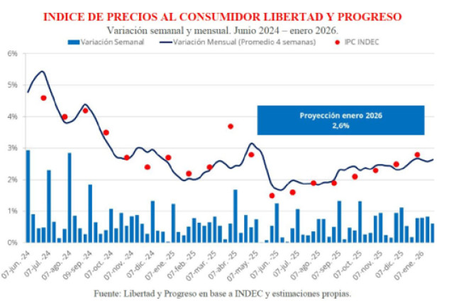 Desde la Fundación Libertad y Progreso, el economista jefe Iván Cachanosky señaló que “la inflación sufrió un retroceso en los últimos meses producto de la incertidumbre electoral, que se trasladó en una suba del dólar”. En ese sentido, agregó que, una vez despejado el ruido político, “esperamos que la inflación retome su sendero bajista” y proyectó que podría ubicarse en torno al 1% mensual hacia la segunda mitad del año, con una inflación interanual cercana al 18% al cierre del período.