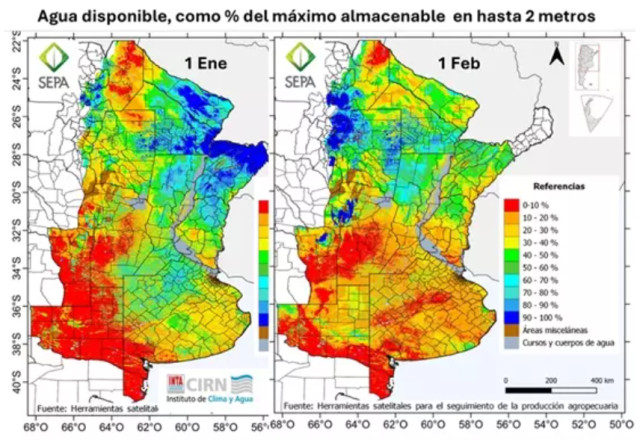 Para el balance hídrico que elabora SEPA, enero comenzó con más del 50 % de la capacidad de almacenamiento en buena parte de la Pampa Ondulada, la Pampa interior y, sobre todo, el norte del país, a excepción del noroeste. En cambio, el almacén habría estado más limitado en el oeste de la región Pampeana, partes del sur del litoral y gran parte de la Depresión del Salado y sur de Buenos Aires.
