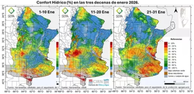 “Para enero, el confort se mantuvo alto durante todo el mes en el norte, por la combinación de las lluvias ocurridas en el mes y el almacenamiento de las previas”, señaló Mercau. En el oeste y en el sur pampeano, en cambio, predominaron niveles bajos de confort. “En concordancia con las lluvias, al oeste se revirtieron hacia fin de enero, mientras que en el sur hubo zonas que, si bien estuvieron en buen estado a mediados de mes, terminaron en sequía”, especificó el investigador.