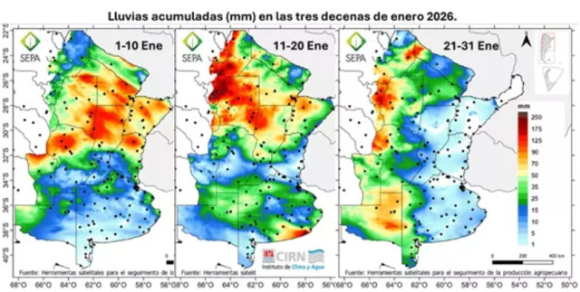 Para la agricultura en secano de las regiones Pampeana y Chaqueña en Argentina, más de 35 millones de hectáreas con cultivos anuales para grano o fibra, el clima de enero es decisivo. En la región, la demanda de agua para transpirar de una cobertura total verde se aproxima a los 180 mm, mientras que el aporte por lluvias va desde unos 150 a 100 mm, en promedio, excepto el extremo sudoeste donde solo alcanza 50 mm.
