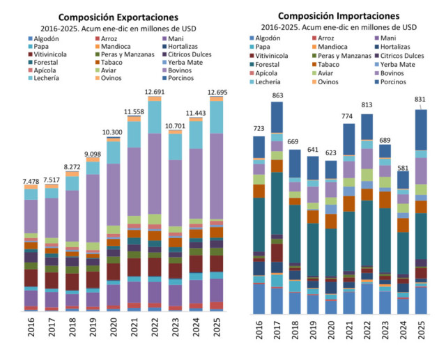 Del lado de las importaciones, el total promedió USD 3.222 millones entre en 2025. Nuevamente, el complejo granario marcó la cancha, explicando el 71% de las compras externas. Luego se ubicaron la actividad forestal (9%), el sector porcino y algodonero con una participación del 4%. El 11% restante se dispersó entre otras actividades de menor peso.