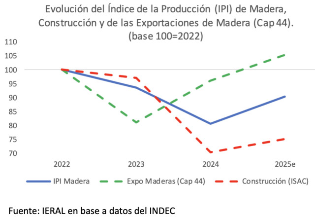 En esta línea, se observa que el Índice de Producción Industrial de Madera (IPI Madera) elaborado durante el 2023 tuvo una caída del 6%, explicado por la caída tanto de la demanda del sector de la construcción (-4%) como por una fuerte caída en las exportaciones (-19%). En 2024 el sector maderero tuvo una contracción aún más pronunciada (-14%) explicada principalmente por la caída del 27% en la actividad de la construcción (la cual no pudo ser compensada totalmente por las exportaciones a pesar del crecimiento del 18% registrado ese año). A partir de allí, en 2025 observamos un crecimiento del 12% en el índice industrial sectorial, con crecimiento de las exportaciones además de cierta recuperación de la construcción.