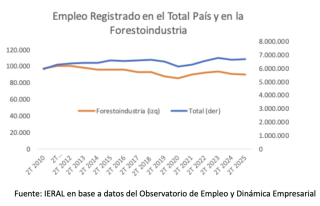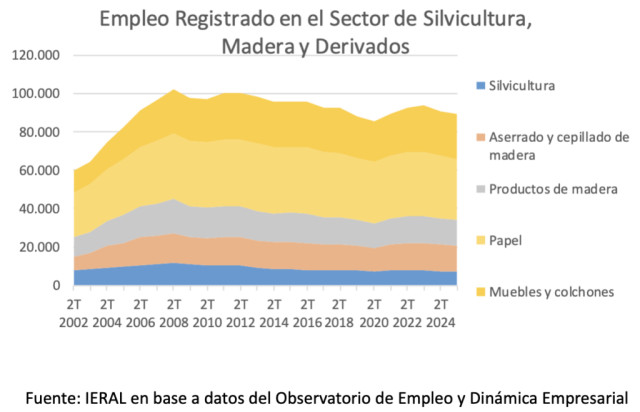Este sector, que llegó a explicar más de 100 mil puestos de trabajos registrados a nivel nacional en 2011 y 2012, ha mostrado un estancamiento desde entonces y actualmente registra aproximadamente 90 mil puestos de trabajo. En los últimos tres años se observa una caída del orden del 5% al 7% en todos los subsectores (silvicultura, aserrado, productos de madera y papel) con la única excepción del sector de muebles (donde el empleo generado cayó en 2024 pero se recuperó rápidamente en 2025).