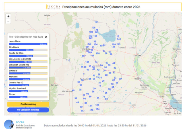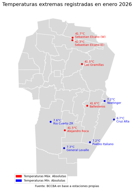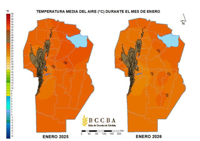Por último, en la figura 3 se comparan las temperaturas medias de este año con las de enero 2025. Se advierte un descenso de 1°C con respecto al año pasado quedando el entorno serrano bajo la isoterma de los 24°C y el noreste cordobés bajo la de los 25°C. En la figura 6 se muestran los cinco registros extremos del mes, las temperaturas más bajas de este ranking se dieron el día 4 del mes; mientras que las más cálidas se dieron el día 1.