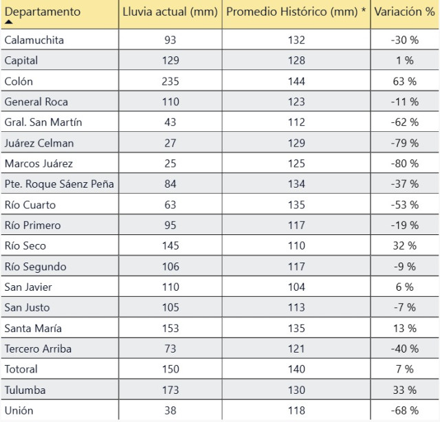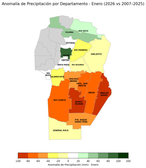 Al analizar la tabla 1 y la figura 4 se destaca que la mayoría de los departamentos presentaron anomalías negativas de precipitación con las mayores desviaciones con respecto al promedio histórico en el centro-sur provincial.