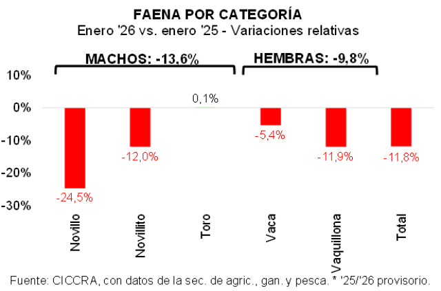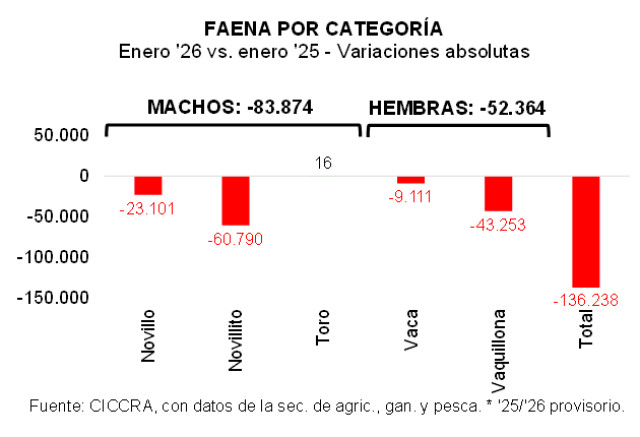 En enero la faena total se ubicó en 1,014 millones de cabezas, resultando 16,1% inferior a la realizada durante el mes previo, corrigiendo los números por la cantidad de días laborables, y 11,8% inferior a la de enero de 2025 (-136,24 mil cabezas).