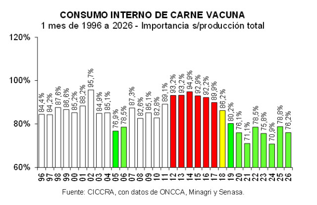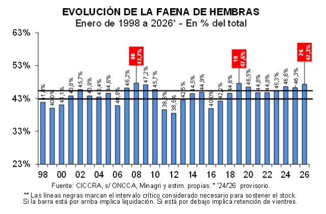 El retroceso de la faena de hembras fue menos significativo (9,8% interanual; -52,36 mil cabezas), totalizando 480,2 mil cabezas en el primer mes del año, y de esta forma su importancia en el total subió de 46,3% en enero de 2025 a 47,3% en enero de 2026. Este guarismo no sólo fue consistente con la continuidad de la reducción del rodeo vacuno, sino que además fue el tercero más elevado entre los últimos treinta y siete eneros. Hubo una mayor contracción de la faena de vaquillonas (-11,9%, -43,25 mil cabezas) con relación a la de vacas (-5,4%; -9,11 mil cabezas).