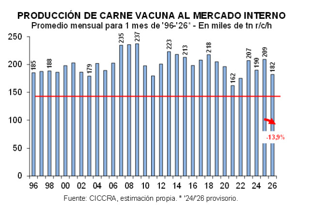 En enero de 2026, producto del muy bajo nivel de faena, la producción de carne vacuna fue equivalente a 239 mil tn r/c/h y experimentó una contracción de 10,0% anual (-26,6 mil tn r/c/h).