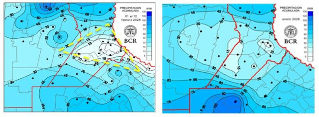 Este año el recorte pluvial arrancó más tarde, cerca de Navidad. Enero también cerró en rojo, pero febrero abrió con algunos eventos que, aunque muy desparejos, dejaron señales mixtas. La franja central y el este de la región siguen, hoy, muy comprometidos —sobre todo en el área de Rosario y hacia San Pedro —donde prácticamente no llovió (triangulo amarillo en el mapa de precipitaciones).