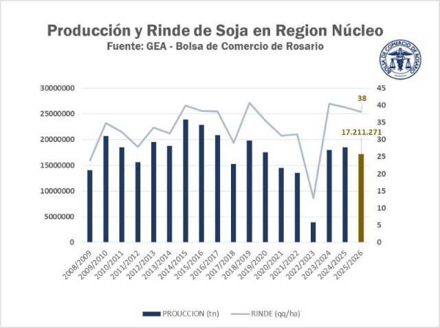 La primera estimación de producción de soja para la región núcleo se ubica en 17,2 Mt. El cálculo parte de una superficie sembrada de 4,58 M ha y un rinde promedio de 38 qq/ha. Son unas 600.000 toneladas menos que el horizonte productivo que se proyectaba antes del recorte de lluvias y del golpe térmico de enero, cuando el potencial se ubicaba en 40 qq/ha.