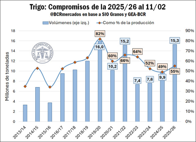 Como es lógico, el acelerado ritmo de embarques de trigo implica un constante fluir de los volúmenes desde el mercado interno. Ya están comprometidas 15,3 millones de toneladas de la campaña 2025/26 y semana a semana el trigo sigue acaparando los buques con destinos extranjeros. Si bien el volumen operado es de los más altos de la historia, en términos de la extraordinaria oferta disponible aún queda tela por cortar. A esta semana, las toneladas comprometidas de la 2025/26 representan un 55% del total de la cosecha, restando un nada despreciable 45% hacia adelante. Este poder de fuego se demuestra suficiente para seguir abasteciendo los mercados de exportación a precios competitivos.